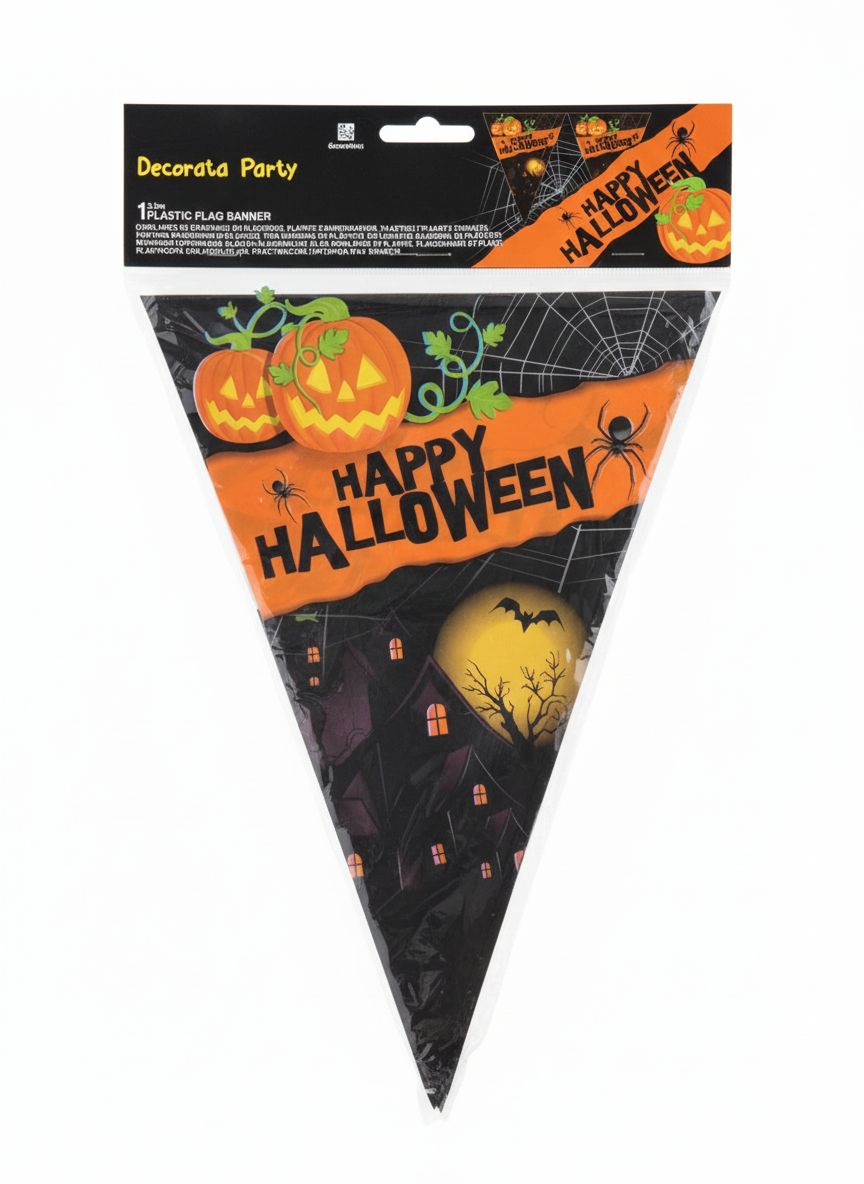 Trasforma la tua festa di Halloween in un evento spettrale e divertente con questo festone decorativo “Happy Halloween” di Decorata Party! Realizzato in plastica resistente e impermeabile, questo banner a bandierine triangolari misura ben 2,3 metri di lunghezza, ideale per adornare pareti, soffitti o ingressi di casa, giardino o locale. Il design accattivante presenta un sfondo nero misterioso con zucche intagliate sorridenti, ragnatele intricate, un ragno nero, una luna piena con pipistrelli in volo e una casa stregata con alberi scheletrici, il tutto in vivaci tonalità arancioni e nere per un’atmosfera tipicamente halloweeniana. Facile da appendere grazie ai fori pretagliati, è perfetto per party a tema, trick-or-treat o decorazioni stagionali. Resistente al vento e alle intemperie, può essere riutilizzato anno dopo anno. Aggiungi un tocco di terrore giocoso al tuo evento – ordina ora e fai impazzire i tuoi ospiti!