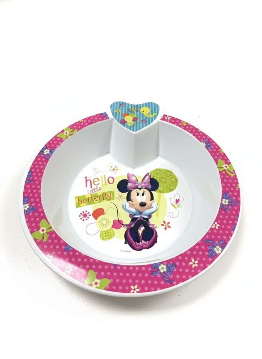 Grazioso piatto per bambine decorato con Minnie Mouse, ideale per rendere il momento della pappa più divertente. Il piatto è suddiviso in tre scomparti, perfetti per separare le diverse pietanze. Design colorato sui toni del rosa con farfalle e scritta “Hello little butterfly”.