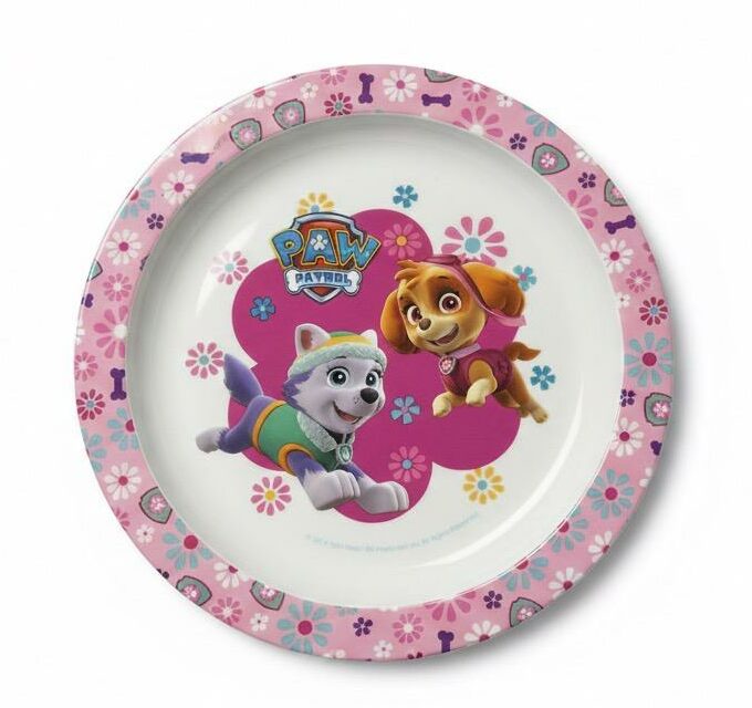 Piatto piano in melamina Paw Patrol con le due eroine preferite dalle bambine: Skye e Everest! Fondo rosa con fiorellini, ossetti e bordo decorato super allegro. Ideale per rendere ogni pasto un’avventura!