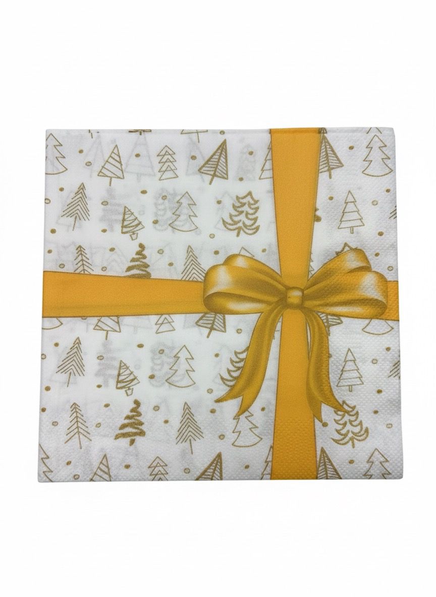 Tovaglioli in pura cellulosa 2 veli di altissima qualità, con una splendida stampa oro a caldo che riproduce un regalo incartato con fiocco e un delicato pattern di abeti stilizzati su fondo bianco neve.